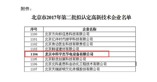 近日,國家高新技術(shù)企業(yè)認(rèn)定管理工作網(wǎng)發(fā)布了《關(guān)于公示豐臺園2017年第二批擬認(rèn)定高新技術(shù)企業(yè)名單的通知》,北京中科宇杰節(jié)電設(shè)備有限公司通過認(rèn)證,榮獲“國家高新技術(shù)企業(yè)”的殊榮。